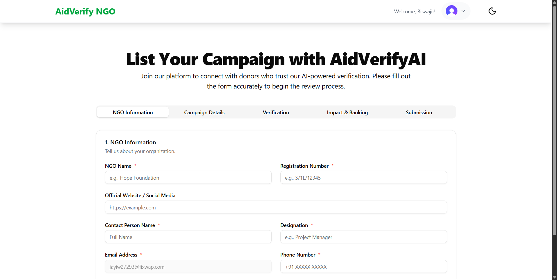 - 🧾 OCR Document Processing: Automated document verification for NGO applications