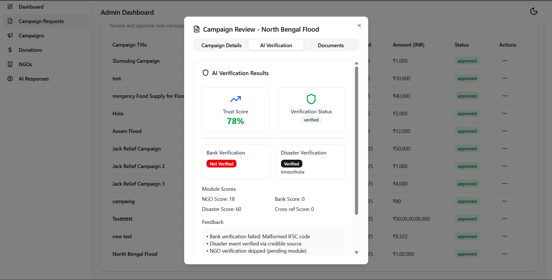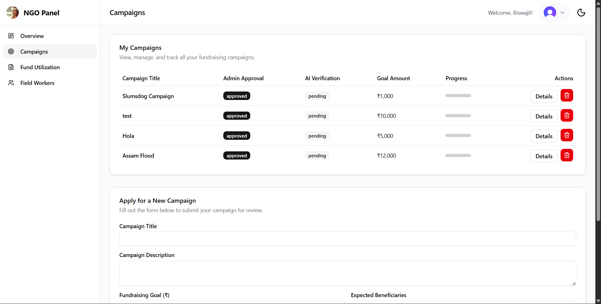 - 🖥️ Multi-Role Dashboard: Separate interfaces for donors, NGOs, admins, and field workers